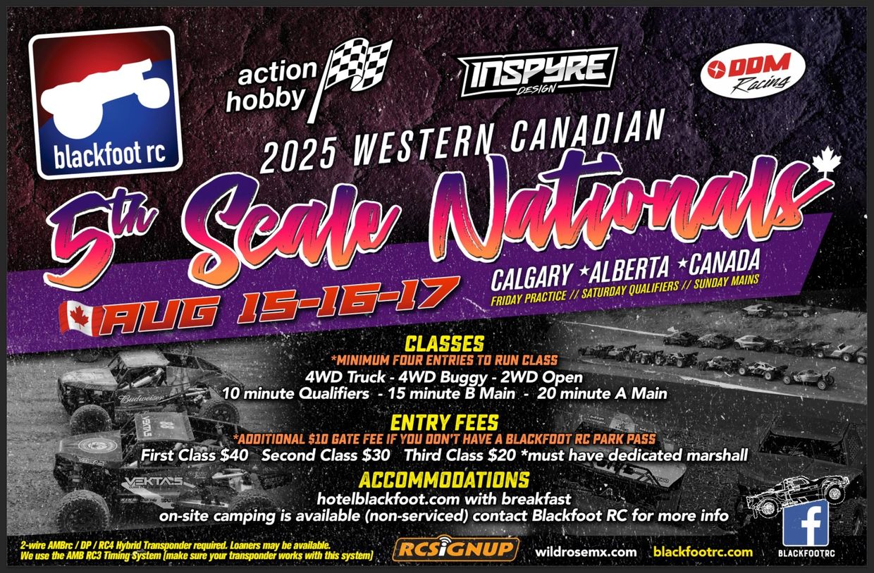 August 15-16-17 we will be hosting the 2025 Western Canadian 1/5 Scale Nationals! This is a full weekend event with on-site camping and pits.